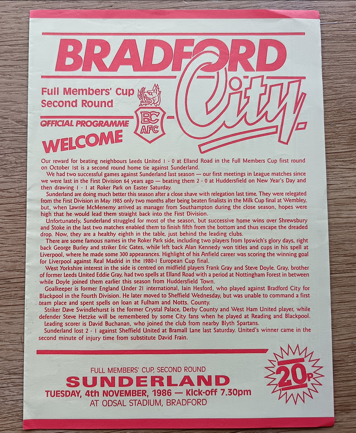 Bradford City v Sunderland FMC 1986/7