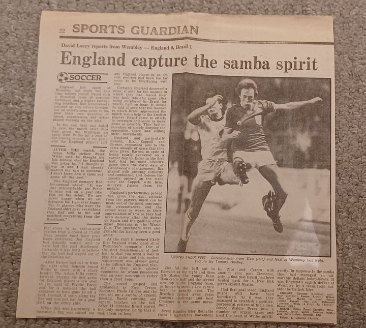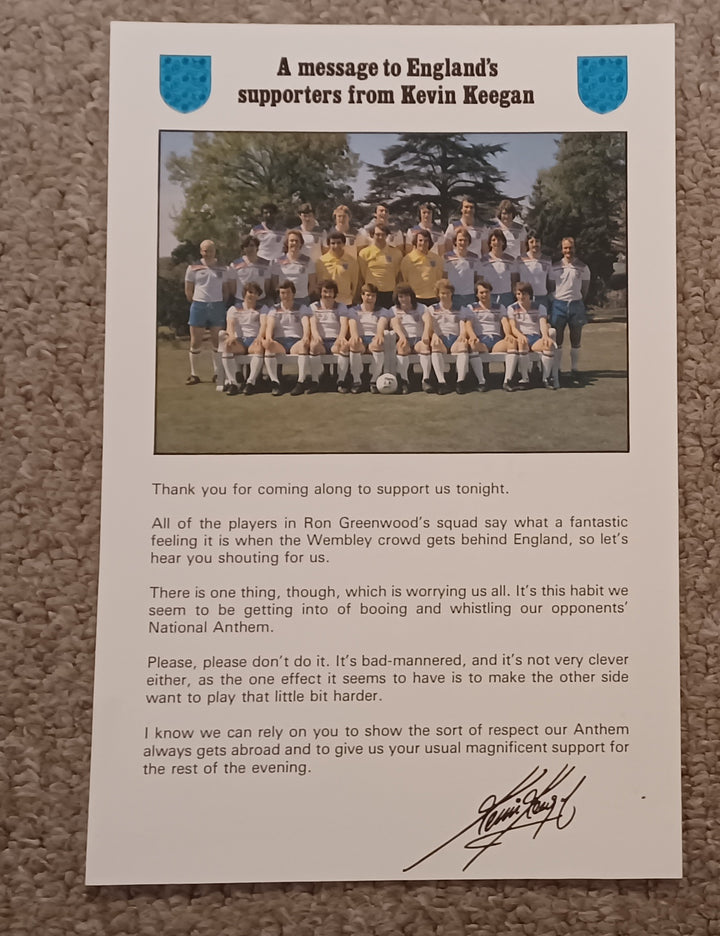Programme in excellent condition with original match report from the Sports Guardian. Also includes a flyer with a message from England captain Kevin Keegan.