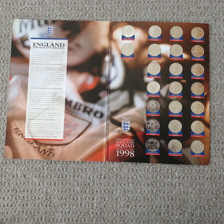 Complete. This collection was issued by Sainsbury for the 1998 World Cup and endorsed by the FA. 23 coins/medals of the players going to France. Very good condition.