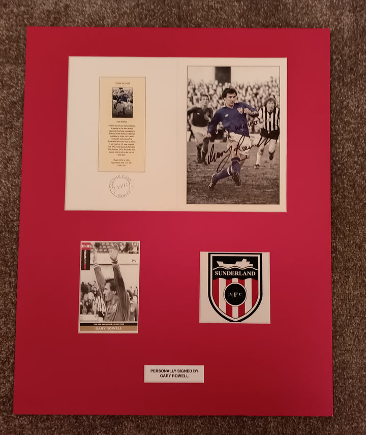 20x16 inch display. Signature obtained vis private correspondence. Image depicts Gary scoring against Newcastle in the famous 4-1 win when he scored his 1st hatrick for Sunderland in February 1979.