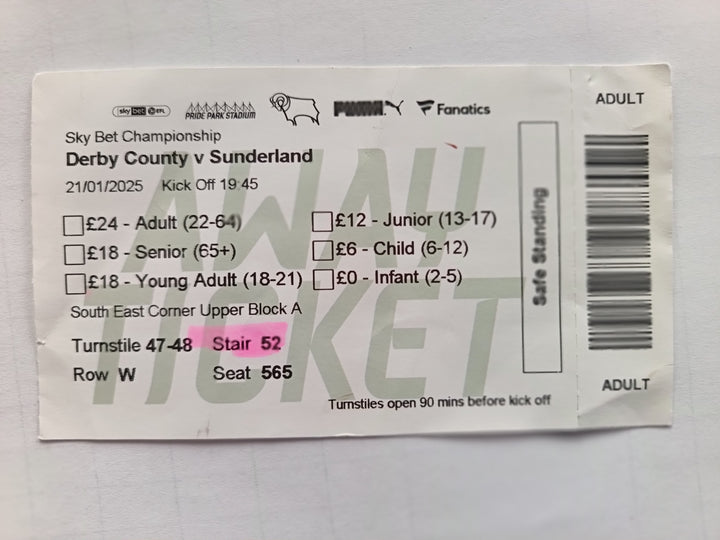 Match Ticket Derby County v Sunderland 2024/5
