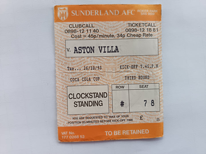 Match Ticket Sunderland v Aston Villa Coca Cola Cup 1993/4