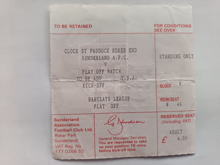 Match Ticket Sunderland v Newcastle Utd 1989/90 Play Off semi final