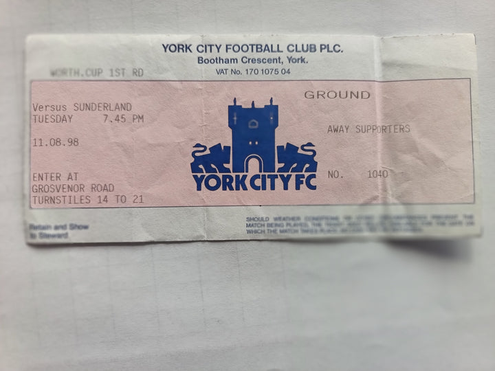 Match Ticket York City v Sunderland Worthington Cup 1998/9