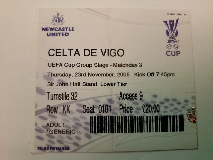 Newcastle United v Celta De Vigo Match Ticket UEFA Cup 2006/07