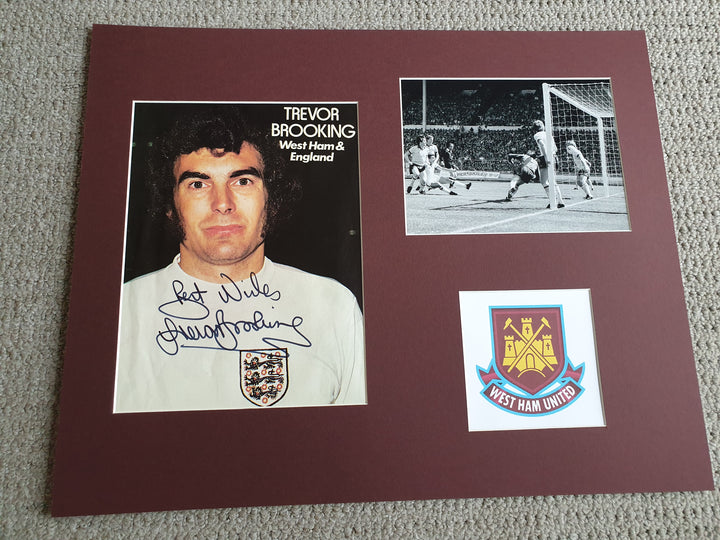20x16 inch. Trevor Brooking West Ham and England. A4 signed magazine image together with that iconic image of Brooking scoring the winner against Arsenal in the 1980 FA Cup final.