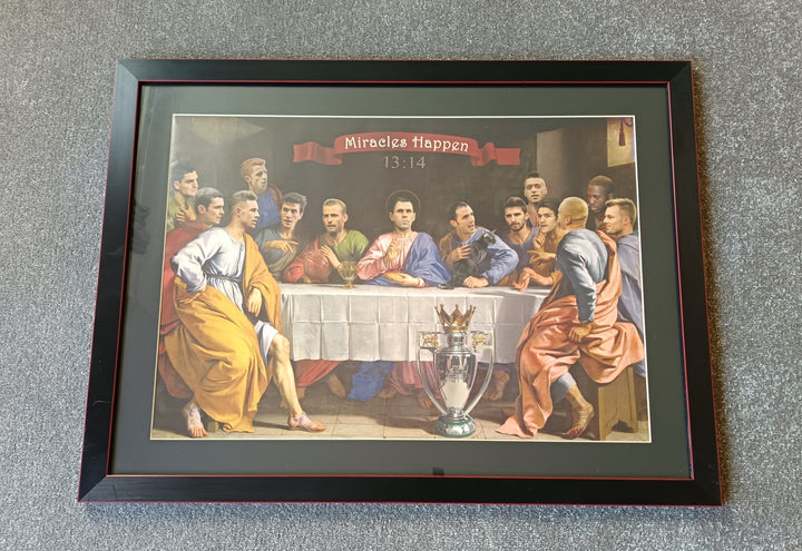 Measures 29x22 inches. A rare print depicting " the last supper" and Sunderland's last effort to avoid relegation in the 2013/14 season which is now known as the greatest escape from Premier League relegation in history. The print is rare simply as the Premier League banned it from being used due to copyright. This has been superbly mounted and professionally framed.