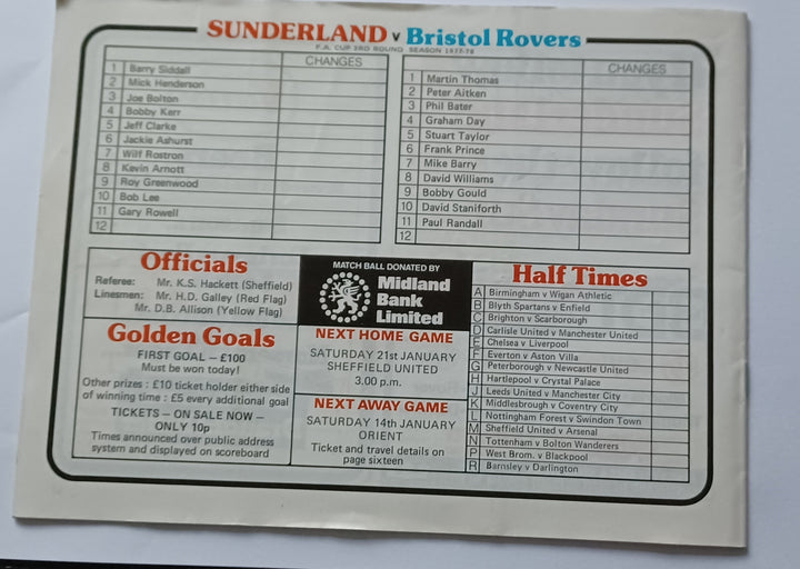 Sunderland v Bristol Rovers 1977/78 FA Cup 3rd Round