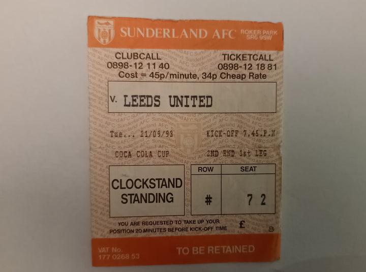Sunderland v Leeds Utd Match Ticket 1993/4 Coca Cola Cup