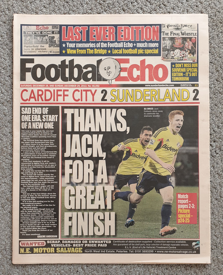 The last ever Sunderland Football echo which ceased on the 28th December 2013 after 106 years. Mint condition.